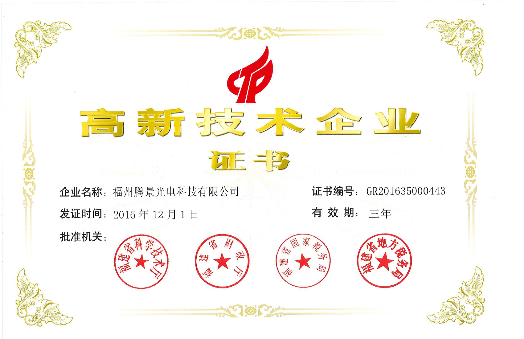 福州凤凰联盟官方网站光电科技有限公司于2016年12月1日,正式获得高新技术企业认证。本次被评定为国家高新技术企业,是凤凰联盟官方网站光电发展史上的一个里程碑,是对我司不断技术创新突破的肯定,也提醒着我们必须推动公司在创新与研发的进程。未来,公司的将继续加大人才素质的培养,为创新研发提供保证。作为高新技术企业,我司将更加重视技术创新,管理创新、服务创新,依靠高新技术、规范经营、科学化管理提升企业品牌形象,从而进一步提升企业市场核心竞争力,再创辉煌。我司也会更加配合科研机构,向其提供优质的为祖国的光学元器件,为祖国的科研事业进一份力。
